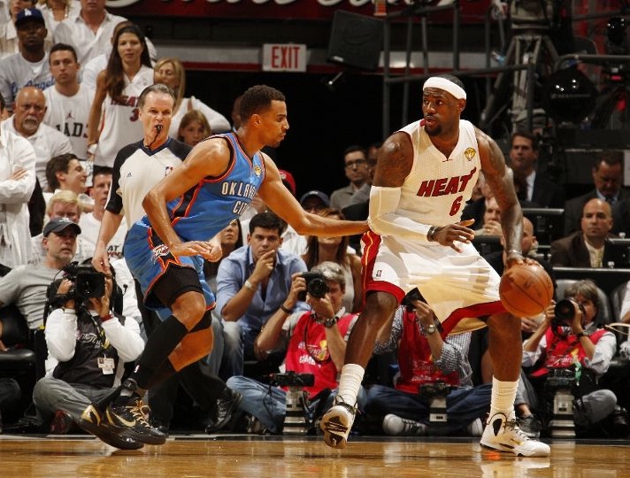 În actul decisiv, undeva spre final, LeBron James a fost înlocuit, având crampe musculare, iar Oklahoma a preluat conducerea pe tabela de marcaj. După doar un minut MVP-ul sezonului 2011/12 a revenit pe parchet marcând imediat un coș de trei puncte care a adus avantajul definitiv de partea lui Heat. Mario Chalmers a marcat ultimele cinci puncte ale învingătorilor.