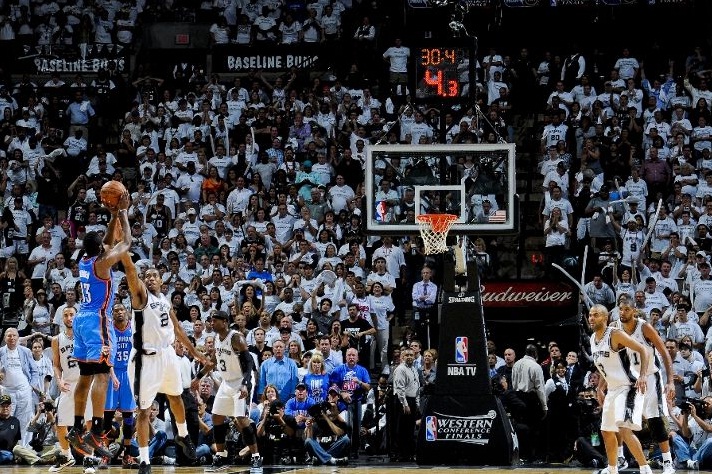 Oklahoma City Thunder a depășit pe San Antonio Spurs, scor 108-103, în Meciul 5 al finalei Conferinței Vest în liga profesionistă nord-americană de baschet masculin - ediția 2011/12. Este prima victorie în deplasare pentru o formație în penultimul act al actualei ediții în NBA.