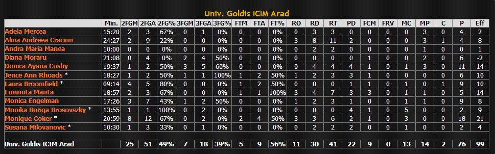 Din cele 12 jucătoare, 11 au reușit să-și treacă numele pe lista marcatoarelor cu cel puțin un punct, singura care nu a izbutit să marcheze a fost Andra Manea. De asemenea, 11 din 12 baschetbaliste au avut cel puțin 1 la eficiență, doar Diana Moraru a avut -2 la acest capitol.