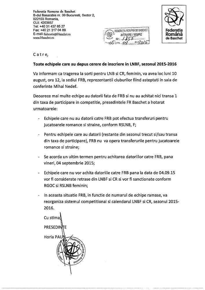 Situația rămâne incertă în Liga Națională de Baschet feminin. Doar cinci cluburi și-au achitat toate datoriile către Federația Română de Baschet astfel că numărul echipelor ce vor lua startul în noul sezon competițional rămâne necunoscut. Cu toate aceste probleme, forul românesc a remis o adresă tuturor cluburilor prim divizionare anunțând mai multe măsuri pe care urmează să le întreprindă.