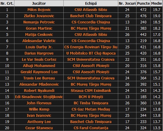 Milos Bojovic are cea mai bună medie de puncte dar nu e și coșgheterul campionatului după cele 26 de etape ale sezonului regulat. Zlatko Jovanovic este jucătorul care-l devansează pe sârbul Sibiului în clasamentul celor mai multe puncte marcate. Conducătorul de joc al Timișoarei a totalizat 476 puncte. El a jucat însă o partidă în plus față de Milos Bojovic și de aceea media sa de puncte este mai scăzută cu 0.7 puncte, adică o medie de fix 19 puncte pe confruntare. Pentru Zlatko Jovanovic vârful la capitolul ofensiv a fost înregistrat chiar într-un meci cu CSU Sibiu când a marcat 36 de puncte. Pe lângă acel meci, bosniacul a mai avut alte trei partide în care a marcat cel puțin 30 de puncte. La capitolul procentaje, Jovanovic stă puțin mai bine, cu 52.6% de la 2 puncte, 40.4% de la 3 puncte și 85.4% de la linia aruncărilor libere. Și Zlatko Jovanovic a fost desemnat cel mai valoros jucătorul etapei, tocmai datorită prestației sale ofensive.