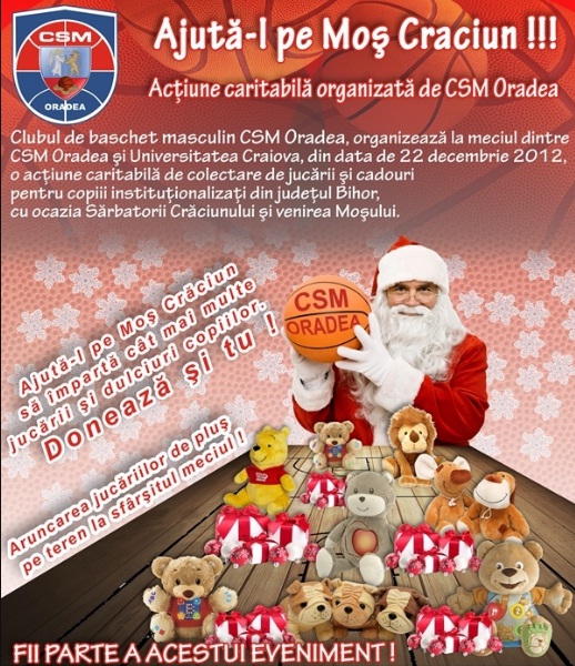 Astfel, pe 5 decembrie, la meciul CSM Oradea - BC Mureș s-au colectat hăinuțe, cărți și produse alimentare, pentru ca pe 22 decembrie, la jocul CSM Oradea - SCM U Craiova să aibă loc acțiunea 'plușurile pe teren'.