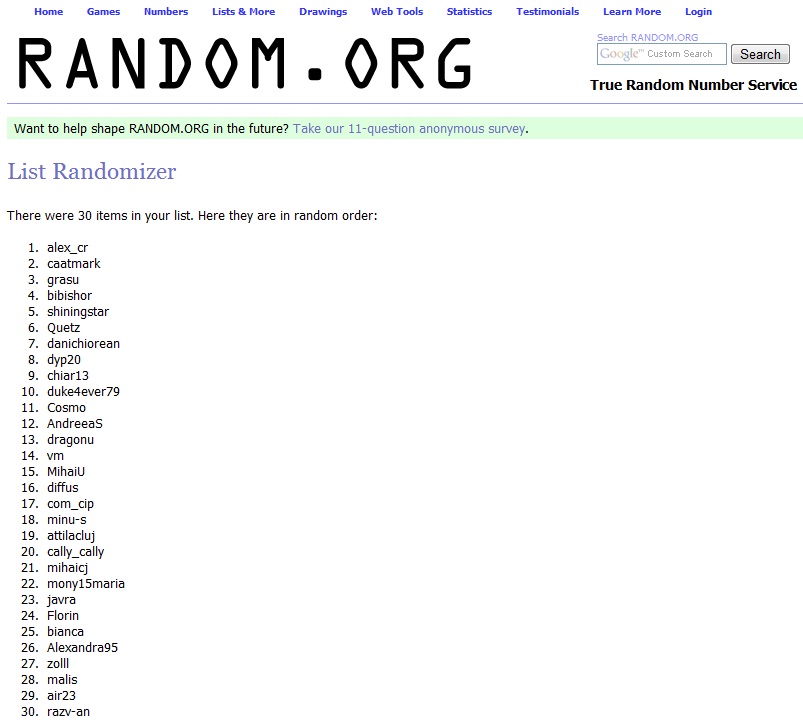Timp de aproximativ o săptămână, 30 de utilizatori ai site-ului Total Baschet au răspuns corect la întrebarea săptămânii: Care este numele antrenorului secund de la "U" Mobitelco BT Cluj - Napoca? R: Dorin "Bobo" Pintea. Luni, 27 august, a avut loc prima extragere, iar fericitul câştigător al unui abonament în valoare de 150 RON, pus la dispoziţie de către "U" Mobitelco BT Cluj-Napoca şi Total Baschet, este utilizatorul "alex_cr". Acesta va fi contactat de către site-ul nostru pentru a-şi ridica premiul.