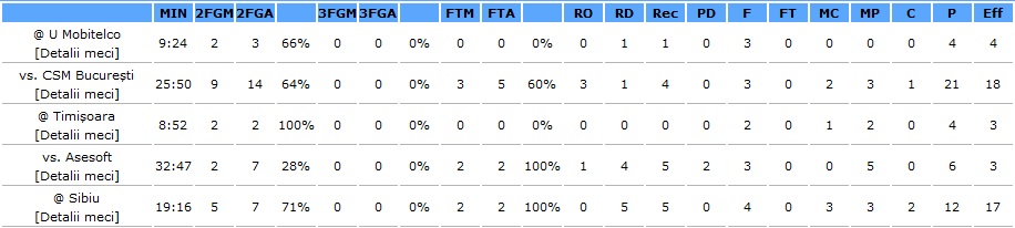 Iată linia statistică în cele cinci meciuri pentru pivotul în vârstă de 31 ani: