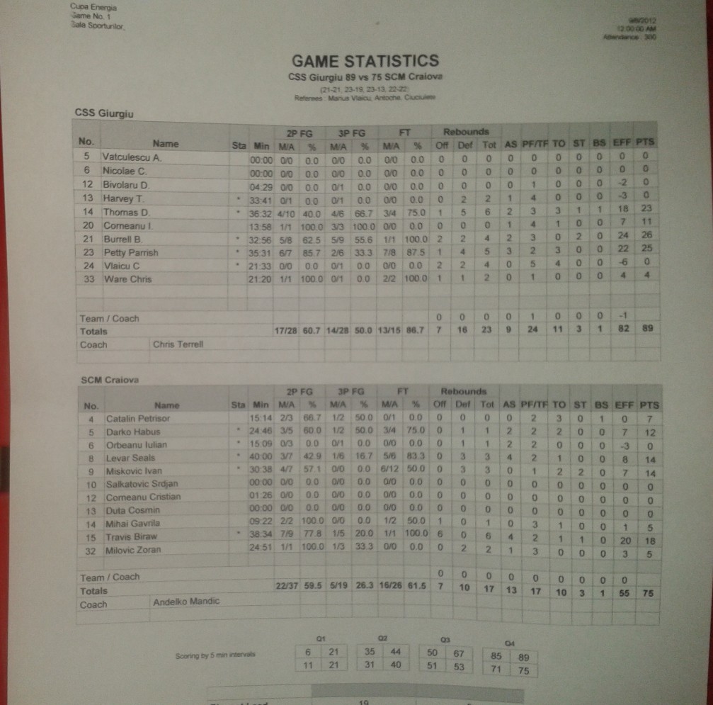 În replică Travis Biraw a terminat cu 18 puncte, 6 recuperări şi 4 pase decisive, LeVar Seals şi Ivan Miskovic, ambii cu câte 14 puncte. Statistica meciului o puteţi vizualiza în cele ce urmează: