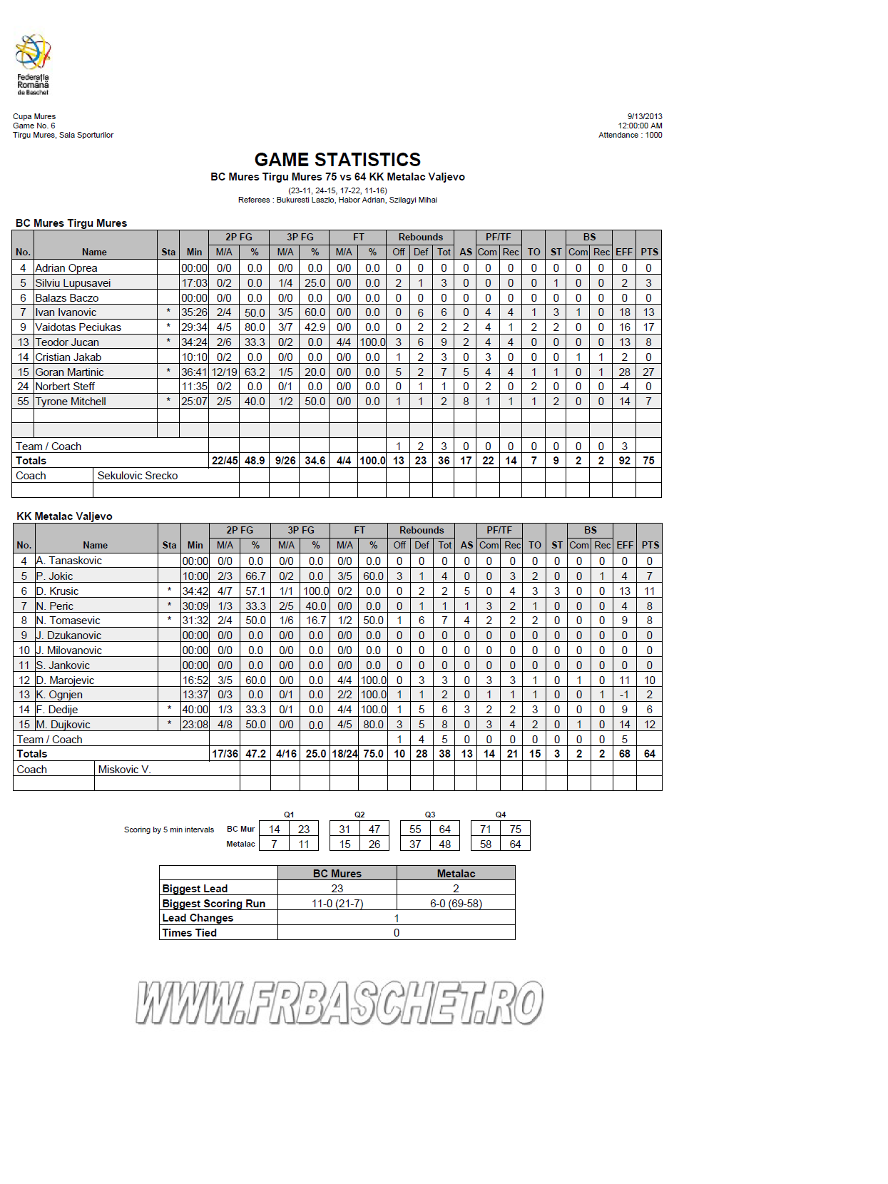 Cupa Mureș - Statistica meciului BC Mureș - Metalac Valjevo, scor 75-64
