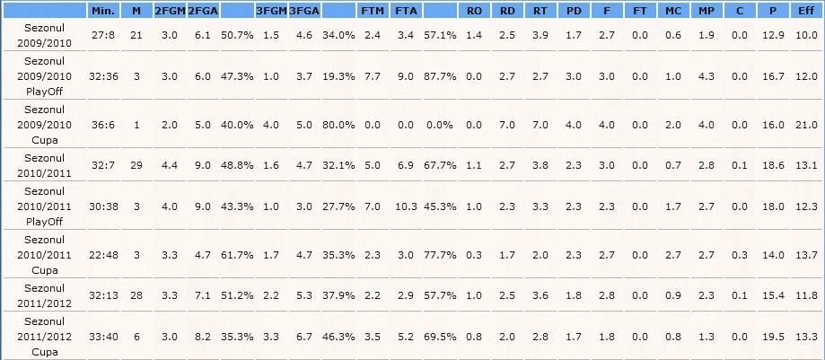 De asemenea, în sezonul 2011/12 a fost în declin. Dovadă sunt cele 3.2 puncte mai puțin marcate pe meci față de sezonul anterior, situație dublată de statistica în coborâre la recuperări și pase decisive. Situație vizibilă în eficiență de altfel.