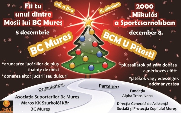 Aceste cadouri vor fi colectate in holul de la intrarea in Sala Sporturilor din Tirgu Mures inaintea meciului BC Mures – BCM U Pitesti din etapa a 12-a a Ligii Nationale de Baschet masculin.