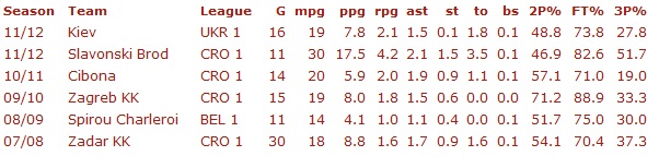 Debutul stagiunii precedente l-a găsit la BC Kiev, acolo unde a evoluat în 16 meciuri având o medie de 7.8 puncte, 2.1 recuperări şi 1.5 pase decisive în aproximativ 19 minute petrecute pe parchet. În partea a 2-a a sezonului s-a transferat la Svjetlost Slavonski (locul 6 în Croaţia) înregistrând medii de 17.5 puncte, 4.2 recuperări, 2.1 pase decisive în 11 partide disputate. Sportivul croat va ajunge duminică la Piteşti, urmând să înceapă pregătirea începând de luni.