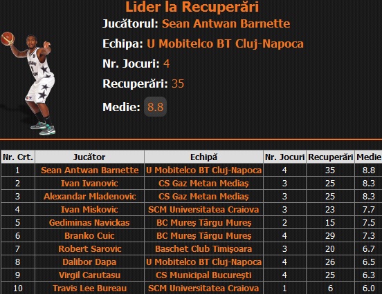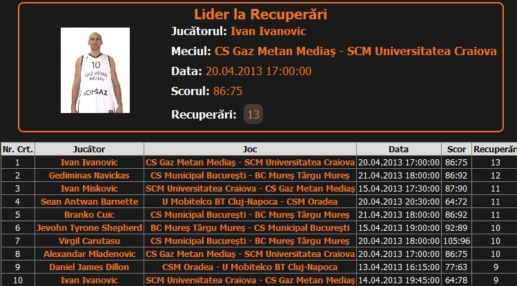 - Robert Sarovic, un total de 20 recuperări, cu o medie de 6.7 pe meci în seria CSU Ploiești vs BC Timișoara, scor 3-0