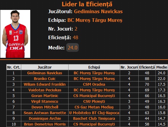 De notat că au fost luați în considerare doar jucătorii care au fost folosiți în toate meciurile seriilor. Gediminas Navickas are cel mai bun indice de eficiență (24.0 pe meci), însă el a fost folosit doar în Meciurile 3 și 4 ale seriei pe care BC Mureș a câștigat-o împotriva lui CSM București.