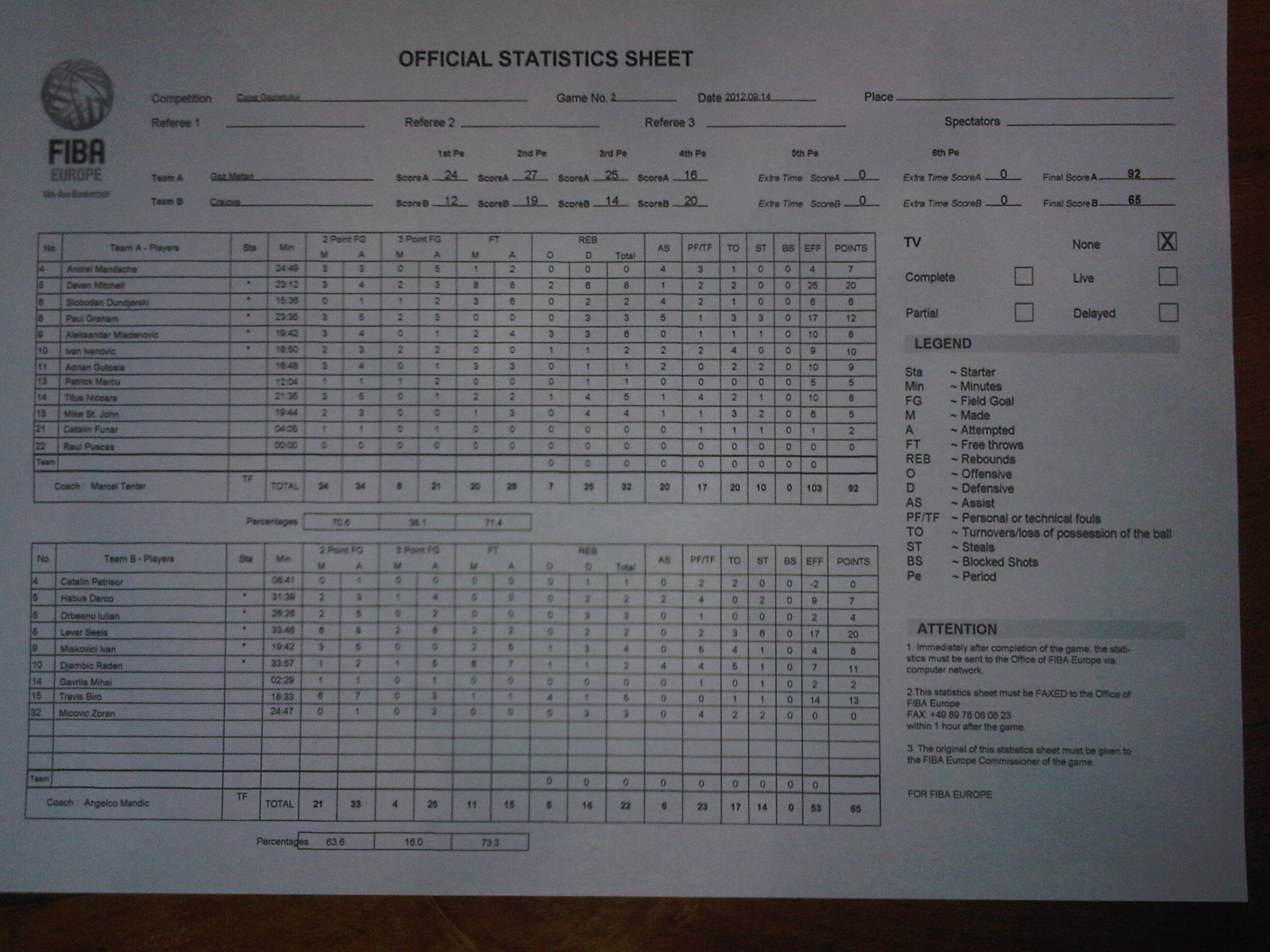 Deven Mitchell a avut 20 puncte, 8 recuperări şi 25 la eficienţă. Paul Graham a adăugat 12 puncte şi 5 pase decisive, iar Ivan Ivanovic a terminat cu 10 puncte. În replică, LeVar Seals a avut 20 puncte şi 6 intercepţii, iar Travis Bureau a terminat cu 13 puncte şi 5 recuperări pentru Craiova. Ionuţ Drăguşin, noul pivot al Craiovei, nu a jucat împotriva fostei sale echipe. De asemenea, a absentat Tudor Dumitrescu, din formaţia învingătoare.