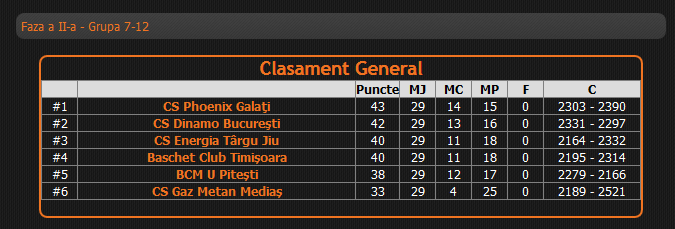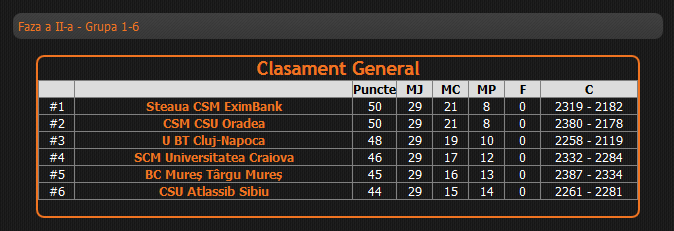 Clasamentul LNBM după 29 de etape arată astfel: